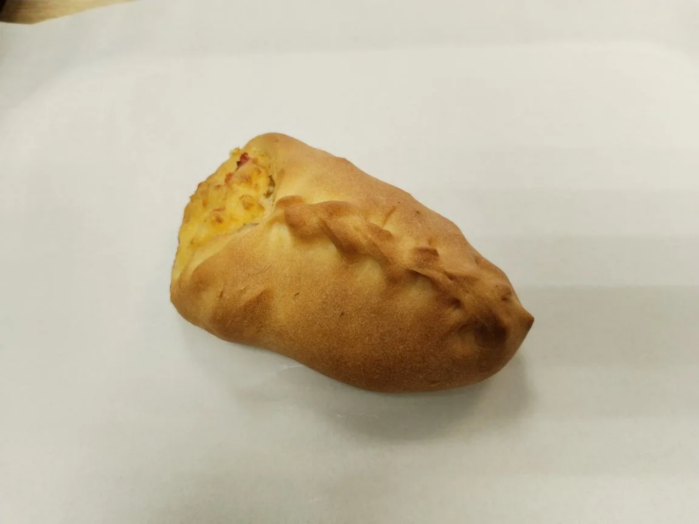 Тесто дрожжевое (мука, дрожжи, сахар, соль, сметана, масло подсолнечное, спред, яйца), курица копчёная, сыр, помидор, чеснок, майонез, кунжут